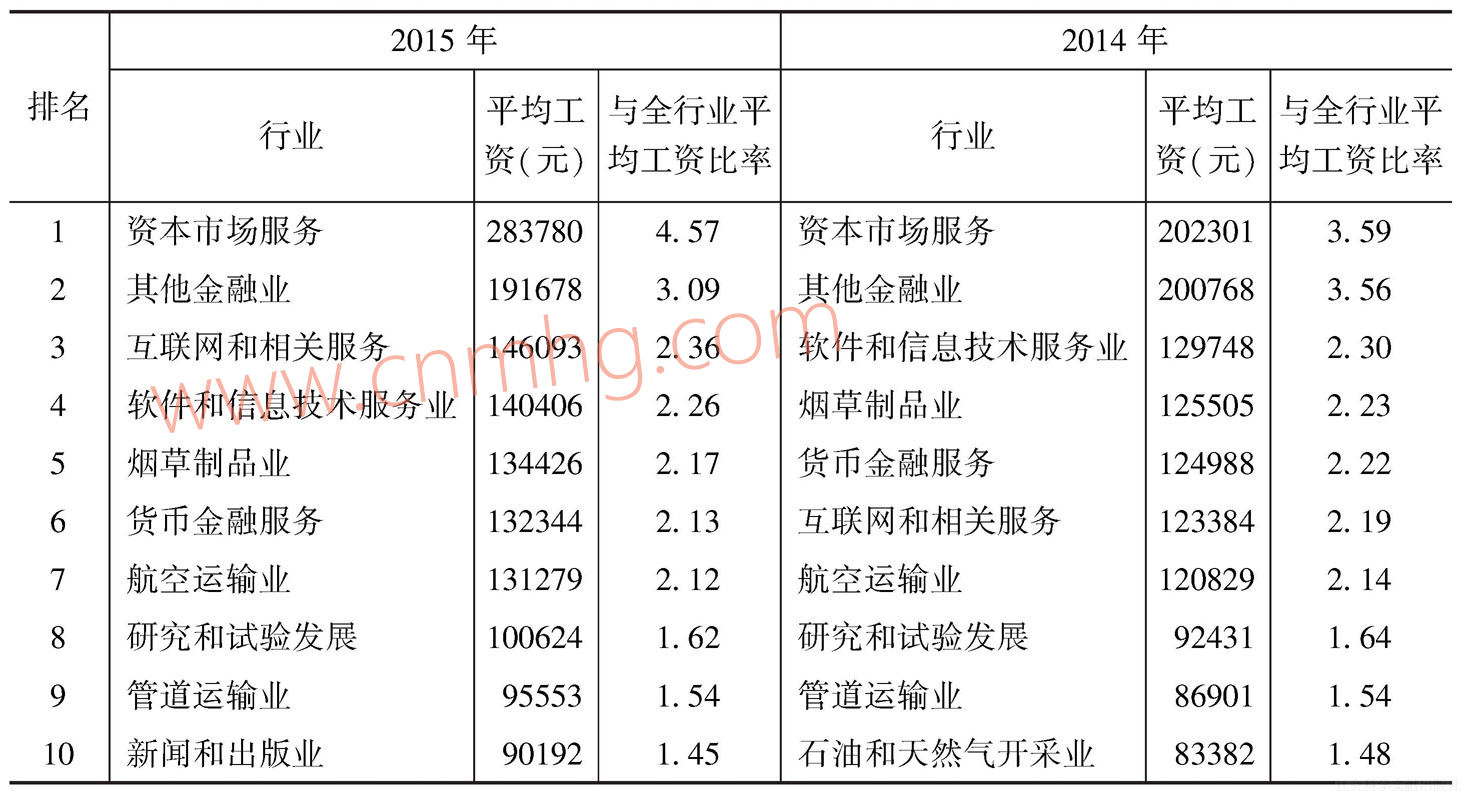 表6-2顯示了城鎮(zhèn)單位平均工資行業(yè)大類(lèi)排名的前十位。與2014年相比,2015年行業(yè)排名略有變化。資本市場(chǎng)服務(wù)和其他金融業(yè)仍然是工資水平最高的兩個(gè)行業(yè);排在三至六位的四個(gè)行業(yè)也沒(méi)有增減,只是其內(nèi)部排名有所變化,主要是互聯(lián)網(wǎng)和相關(guān)服務(wù)業(yè)從第六位上升至第三位,使得軟件和信息服務(wù)業(yè)、煙草制品業(yè)和貨幣金融服務(wù)各下降一位;排在第七至第九的行業(yè)排名也沒(méi)有變化,分別是航空運(yùn)輸業(yè)、研究和試驗(yàn)發(fā)展、管道運(yùn)輸業(yè);石油和天然氣開(kāi)采業(yè)跌出前十,新聞和出版業(yè)成為第十位。對(duì)這十個(gè)行業(yè)進(jìn)行整體觀察,其中屬于壟斷性行業(yè)的有資本市場(chǎng)服務(wù)業(yè)、其他金融業(yè)、煙草制品業(yè)、貨幣金融服務(wù)、航空運(yùn)輸業(yè)、管道運(yùn)輸業(yè),其余行業(yè)即互聯(lián)網(wǎng)和相關(guān)服務(wù)、軟件和信息技術(shù)服務(wù)業(yè)、研究和試驗(yàn)發(fā)展、新聞和出版業(yè),都對(duì)就業(yè)人員的受教育水平和專(zhuān)業(yè)水平有較高要求。由此可以看出,行業(yè)壟斷和人力資本是影響行業(yè)平均工資水平的重要因素。