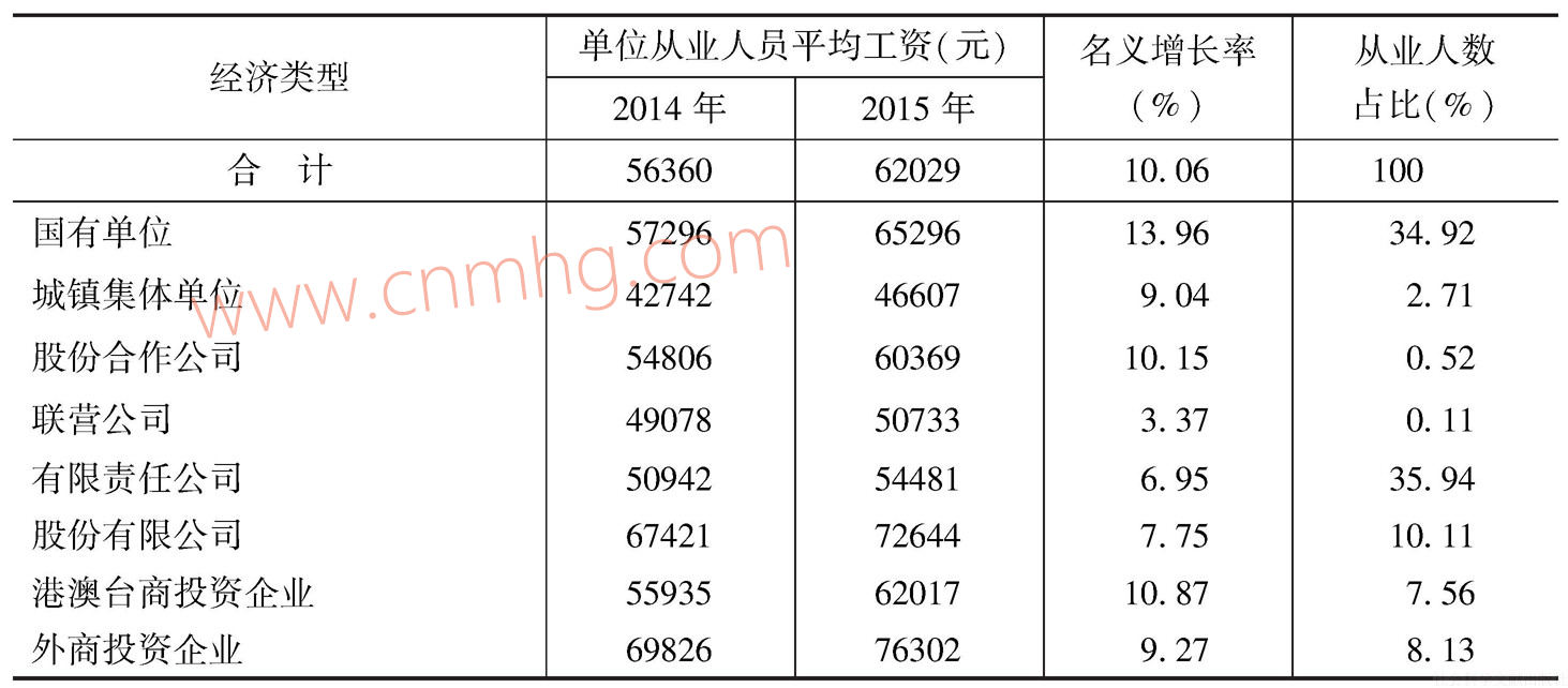 按經(jīng)濟(jì)類(lèi)型劃分的各單位平均工資情況如表6-6所示??梢钥吹?,2015年各經(jīng)濟(jì)類(lèi)型單位平均工資較2014年都有增長(zhǎng),但增長(zhǎng)速度有較大差別。只有國(guó)有單位、股份合作公司、港澳臺(tái)商投資企業(yè)的增長(zhǎng)速度超過(guò)全國(guó)平均水平,其他類(lèi)型單位都低于全國(guó)平均水平。其中,國(guó)有單位增長(zhǎng)速度最高,達(dá)13.96%,主要是進(jìn)行工資改革的機(jī)關(guān)事業(yè)單位大多是國(guó)有單位。聯(lián)營(yíng)公司平均工資增速最低,為3.37%。外商投資企業(yè)仍是工資水平最高的類(lèi)型(76302元),城鎮(zhèn)集體單位雖然增長(zhǎng)速度較快,受原來(lái)基數(shù)影響,仍是工資水平最低的類(lèi)型(46607元),但與其他類(lèi)型單位之間的差距略有縮小。兩者相比,前者是后者的1.64倍。