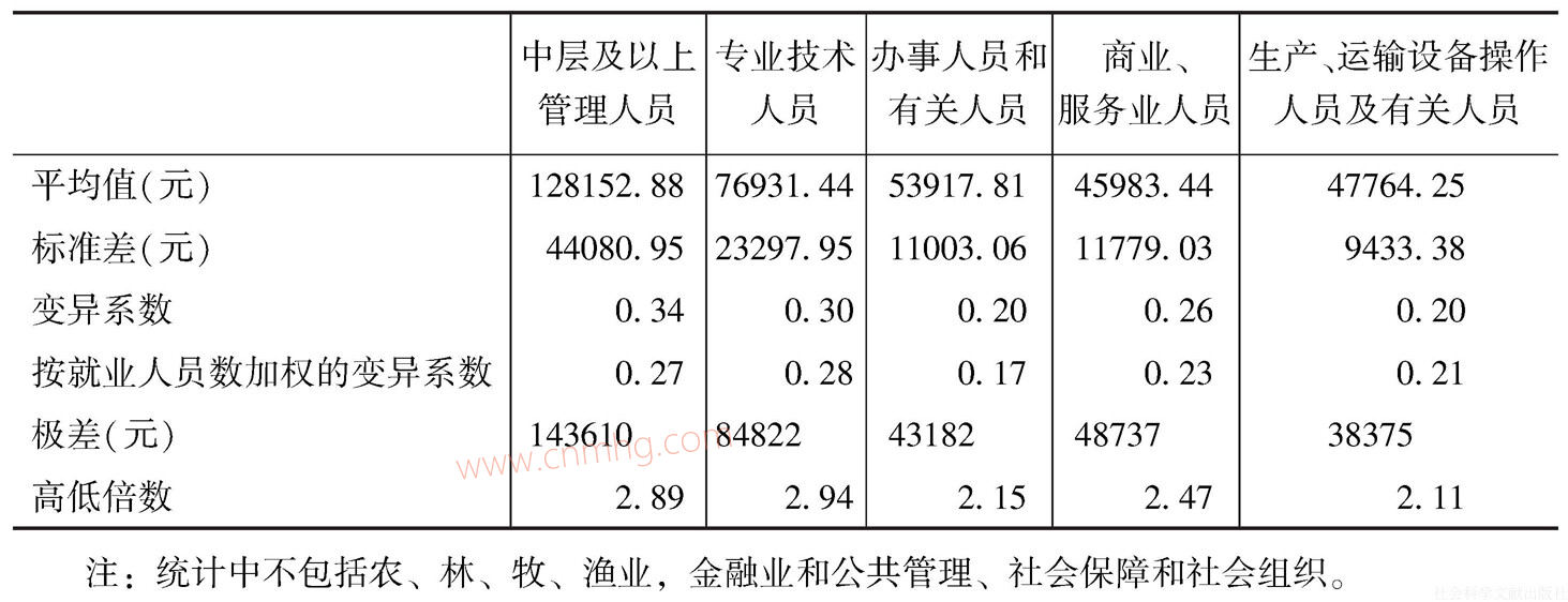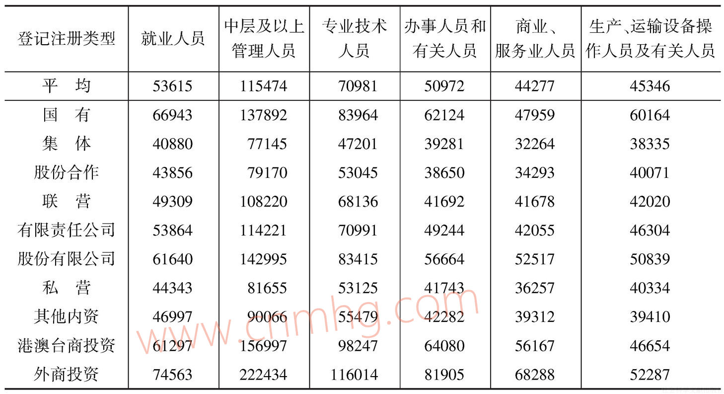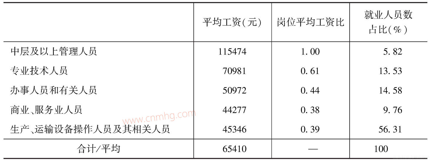表6-10列示了2015年“四上單位”不同崗位平均工資水平及其對(duì)應(yīng)的就業(yè)人員分布情況。第一,崗位平均工資水平從高到低依次為:中層及以上管理人員(11.5萬(wàn)元),專(zhuān)業(yè)技術(shù)人員(7.1萬(wàn)元),辦事人員和有關(guān)人員(5.1萬(wàn)元),生產(chǎn)、運(yùn)輸設(shè)備操作人員及其相關(guān)人員(4.5萬(wàn)元),商業(yè)、服務(wù)業(yè)人員(4.4萬(wàn)元)。第二,此排序與各個(gè)崗位就業(yè)人員的分布正好相反:工資水平最高的中層及以上管理人員占比只有5.82%,而工資水平最低兩組的就業(yè)者占比則達(dá)到了2/3。第三,中層及以上管理人員工資水平比其他各類(lèi)崗位明顯高出一個(gè)“臺(tái)階”,一般生產(chǎn)人員的工資水平僅及其1/3,專(zhuān)業(yè)技術(shù)人員的工資水平也只有60%。