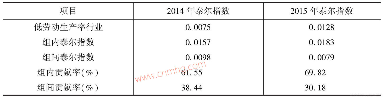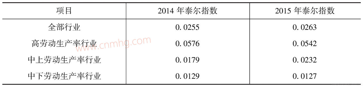 可以明顯看出,各行業(yè)勞動(dòng)生產(chǎn)率呈現(xiàn)四個(gè)臺(tái)階式分布,根據(jù)此分布可以對(duì)各行業(yè)進(jìn)行分組,進(jìn)一步計(jì)算2015年按勞動(dòng)生產(chǎn)率分組的行業(yè)工資組內(nèi)與組間的泰爾指數(shù),以解釋勞動(dòng)生產(chǎn)率差異對(duì)工資水平差異的影響,即根據(jù)勞動(dòng)生產(chǎn)率高低對(duì)行業(yè)的分組,就平均工資分別計(jì)算組內(nèi)差異和組間差異,以組間差異測(cè)度勞動(dòng)生產(chǎn)率因素對(duì)行業(yè)間平均工資差距的影響。