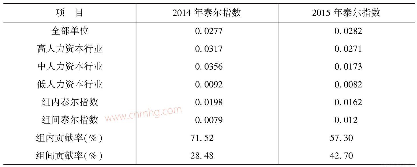 表6-21 不同人力資本行業(yè)門(mén)類(lèi)泰爾指數(shù)分解