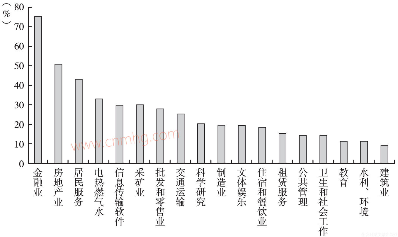圖6-8 2014年各行業(yè)門(mén)類(lèi)大專(zhuān)以上學(xué)歷人數(shù)占就業(yè)人員比重(行業(yè)名稱(chēng)從簡(jiǎn))