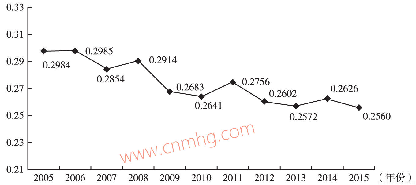地區(qū)間工資水平差距略有縮小,但差異仍然比較顯著。2015年,平均工資最高的北京市(111390元)與最低的河南?。?5043元)相比,極差達(dá)到66347元,高低倍數(shù)達(dá)到2.47倍,各地區(qū)的總體變異系數(shù)為0.256。與2014年(極差60029元,高低倍數(shù)2.42倍,各地區(qū)總體變異系數(shù)0.263)相比,相對(duì)差距略有縮小,絕對(duì)差距仍在繼續(xù)擴(kuò)大。圖6-2顯示的是2005~2015年地區(qū)平均工資的變異系數(shù),總體呈下降趨勢(shì),說(shuō)明地區(qū)之間的平均工資的相對(duì)差異在逐漸減小。