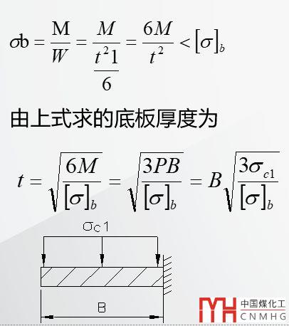 在底板上取單位長(zhǎng)度,則單位長(zhǎng)度上的力P=σc1*B*1。該力產(chǎn)生的彎矩M=PB/2.其力小于許用應(yīng)力,即