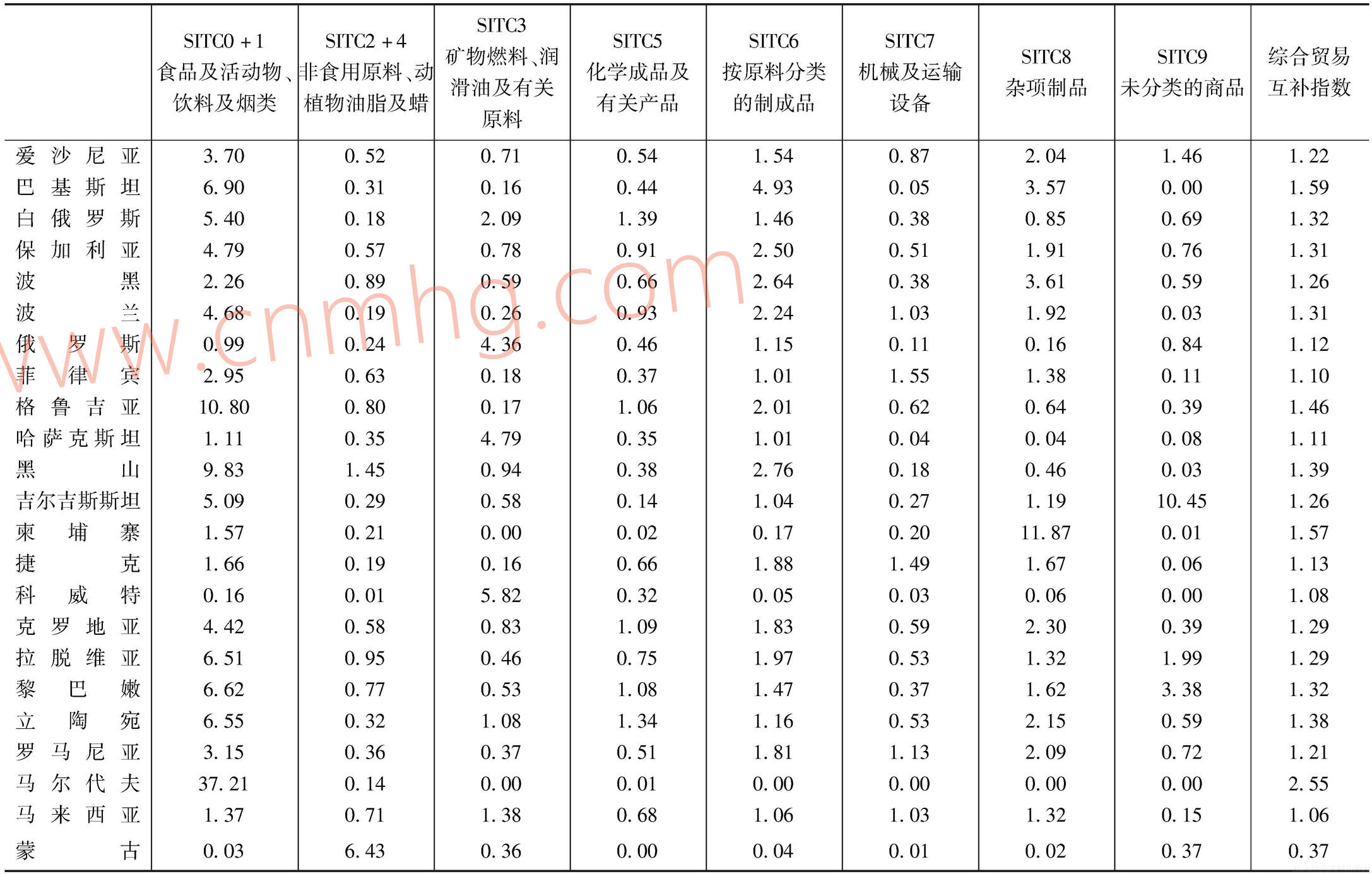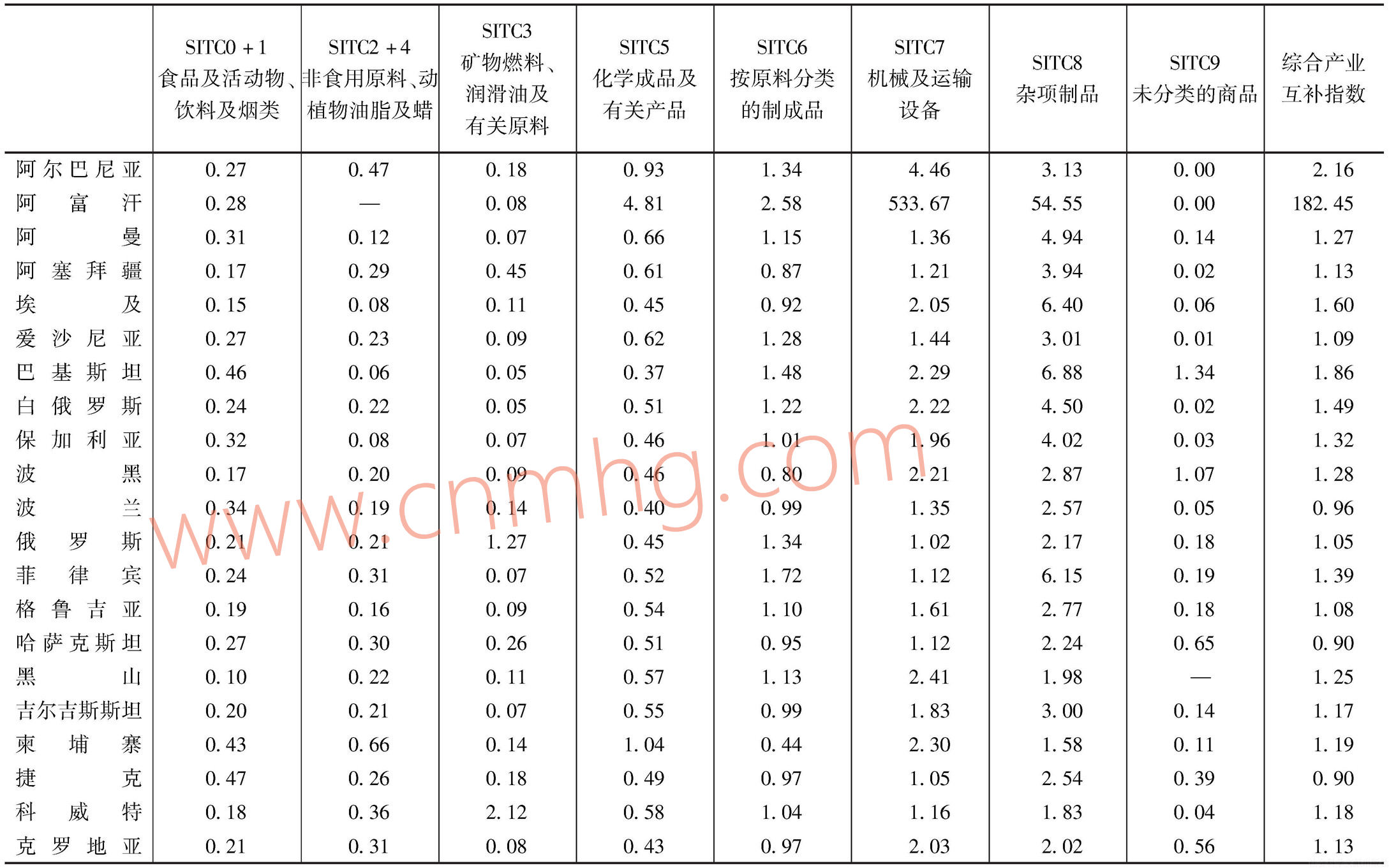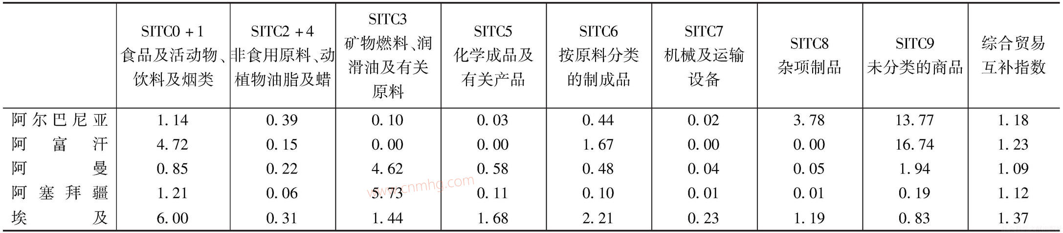 其次,分析中國進(jìn)口、外國出口側(cè)的產(chǎn)業(yè)互補(bǔ)指數(shù)。表3顯示,除了蒙古和印度尼西亞,中國與“一帶一路”沿線國家的綜合產(chǎn)業(yè)互補(bǔ)指數(shù)均大于1,產(chǎn)能合作潛力巨大,而這種潛力在不同國家不同產(chǎn)業(yè)具有較大差異。以食品及活動物、飲料及煙類(SITC0、SITC1)為代表的初級產(chǎn)品計算,互補(bǔ)指數(shù)多數(shù)大于1甚至遠(yuǎn)高于1,互補(bǔ)效應(yīng)顯著;同樣是初級產(chǎn)品的礦物燃料、潤滑油及有關(guān)原料(SITC3),阿曼、阿塞拜疆、俄羅斯、哈薩克斯坦、科威特、沙特阿拉伯、文萊和也門的互補(bǔ)指數(shù)遠(yuǎn)高于1,與中國當(dāng)前油氣資源需求上升相匹配,建設(shè)“一帶一路”可以通過開發(fā)油氣能源新來源緩解當(dāng)前的困境;隨著中國人口紅利逐漸收縮,以按原料分類的制成品(SITC6)和雜項制品(SITC8)為代表的勞動密集型產(chǎn)品也是中國進(jìn)口的重點,其中部分國家的互補(bǔ)指數(shù)高于甚至遠(yuǎn)高于1,互補(bǔ)效應(yīng)明顯;而與中國當(dāng)前進(jìn)口需求互補(bǔ)效應(yīng)較小的包括以非食用原料(燃料除外)、動植物油脂及蠟(SITC2、SITC4)為代表的初級產(chǎn)品,和以化學(xué)產(chǎn)品及有關(guān)產(chǎn)品(SITC5)、機(jī)械及運輸設(shè)備(SITC7)為代表的資本、技術(shù)密集型產(chǎn)品,大多數(shù)互補(bǔ)指數(shù)小于1,互補(bǔ)效應(yīng)不明顯,不是中國進(jìn)口的重點;以未分類的產(chǎn)品(SITC9)為代表的資本密集型產(chǎn)品也不是我國進(jìn)口的突出領(lǐng)域,盡管阿爾巴尼亞、阿富汗、吉爾吉斯斯坦、黎巴嫩與中國在這方面的互補(bǔ)指數(shù)遠(yuǎn)高于1,但這些國家該產(chǎn)品的出口額非常有限。由此可見,多數(shù)初級產(chǎn)品生產(chǎn),尤其是油氣國的油氣產(chǎn)品生產(chǎn)是中國與“一帶一路”沿線國家開展產(chǎn)能合作的重點領(lǐng)域;一些勞動力資源豐富的國家,是中國將勞動密集型產(chǎn)業(yè)轉(zhuǎn)移出去的首選目的地。