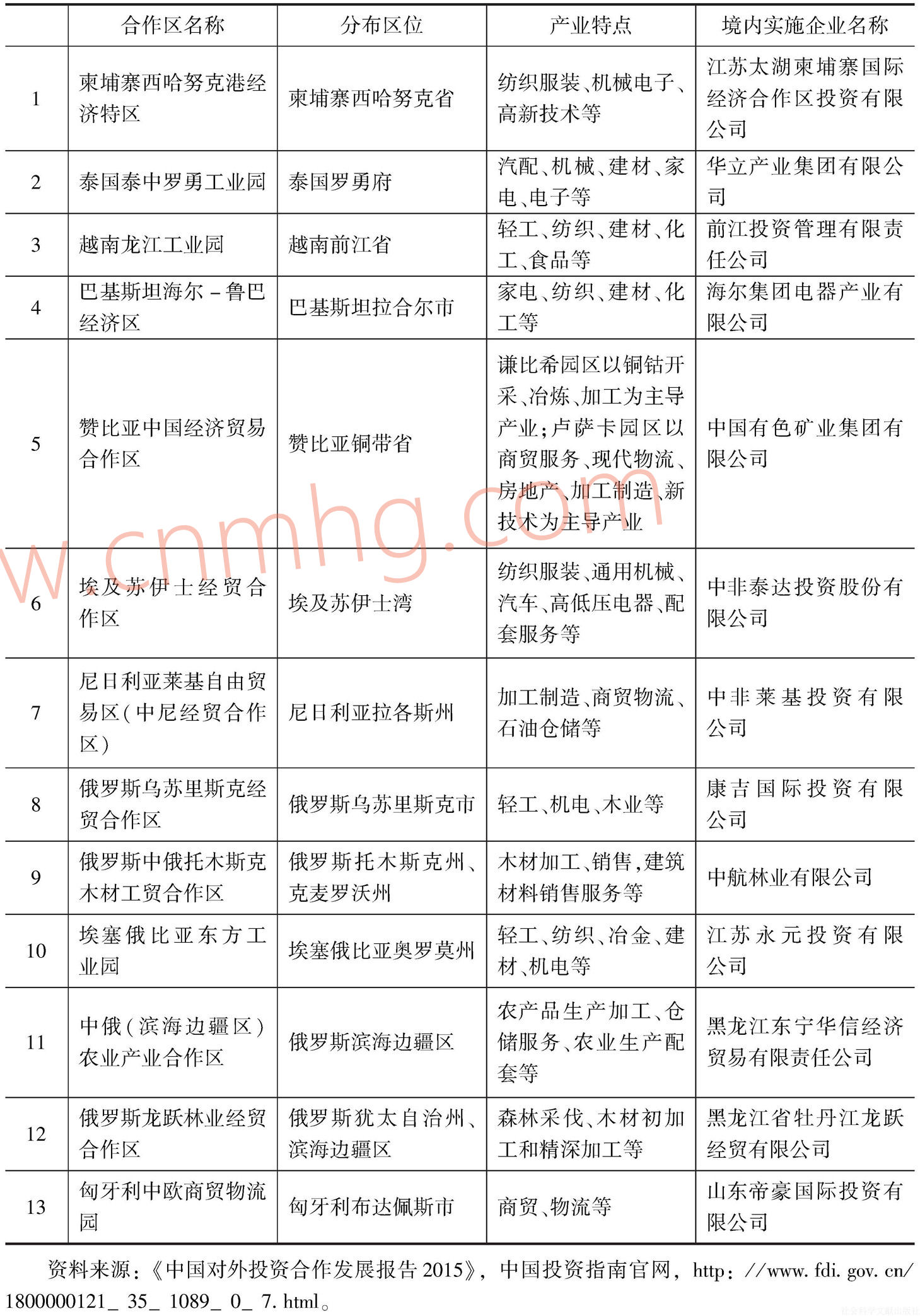 域外經(jīng)貿(mào)合作區(qū)是推進(jìn)“一帶一路”倡議和國際產(chǎn)能與裝備制造合作的有效平臺,已成為促進(jìn)中國和東道國經(jīng)貿(mào)合作雙贏的重要載體。據(jù)統(tǒng)計,截至2015年11月底,中國企業(yè)正在建設(shè)域外經(jīng)貿(mào)合作區(qū)75個,已通過確認(rèn)考核的13個。在建的75個合作區(qū)中,53個分布在“一帶一路”沿線國家;已通過考核的13個合作區(qū)中,10個位于“一帶一路”沿線國家(見表1)。在建的75個合作區(qū)中,有一半以上是與國際產(chǎn)能合作相關(guān)的加工類項目;13家通過考核的合作區(qū),主導(dǎo)產(chǎn)業(yè)涉及有色、輕紡、服裝、汽配、建材、家電等優(yōu)勢產(chǎn)業(yè)。[5]