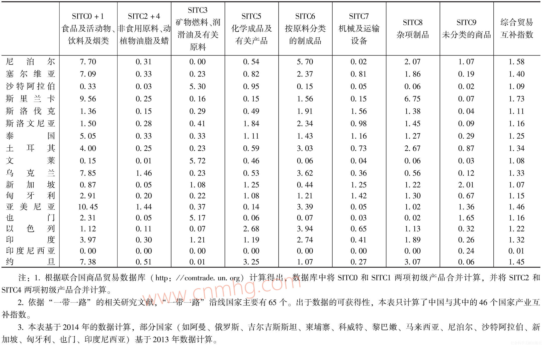 依據(jù)“一帶一路”的相關(guān)研究文獻(xiàn),“一帶一路”沿線國家主要有65個(含中國)。出于數(shù)據(jù)的可獲得性,本處僅測算了中國與其中的46個國家的產(chǎn)業(yè)互補(bǔ)指數(shù),另外18個國家則沒有測算。