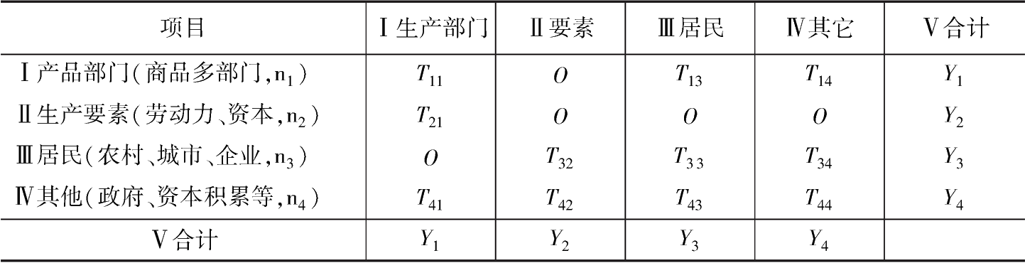 表2中數(shù)據(jù)來源于投入產(chǎn)出表,第一行反映了經(jīng)濟各部門投入和產(chǎn)出使用情況,第二行反映了各種勞動力、資本、土地所獲得的要素收入及分配情況,第三行反映了不同居民家庭的收入來源、消費和儲蓄情況,第四行反映了政府的收入和支出情況,第五行反映了從國內(nèi)或國外其他地區(qū)的商品進出口情況,第六行反映了社會的儲蓄和投資核算。