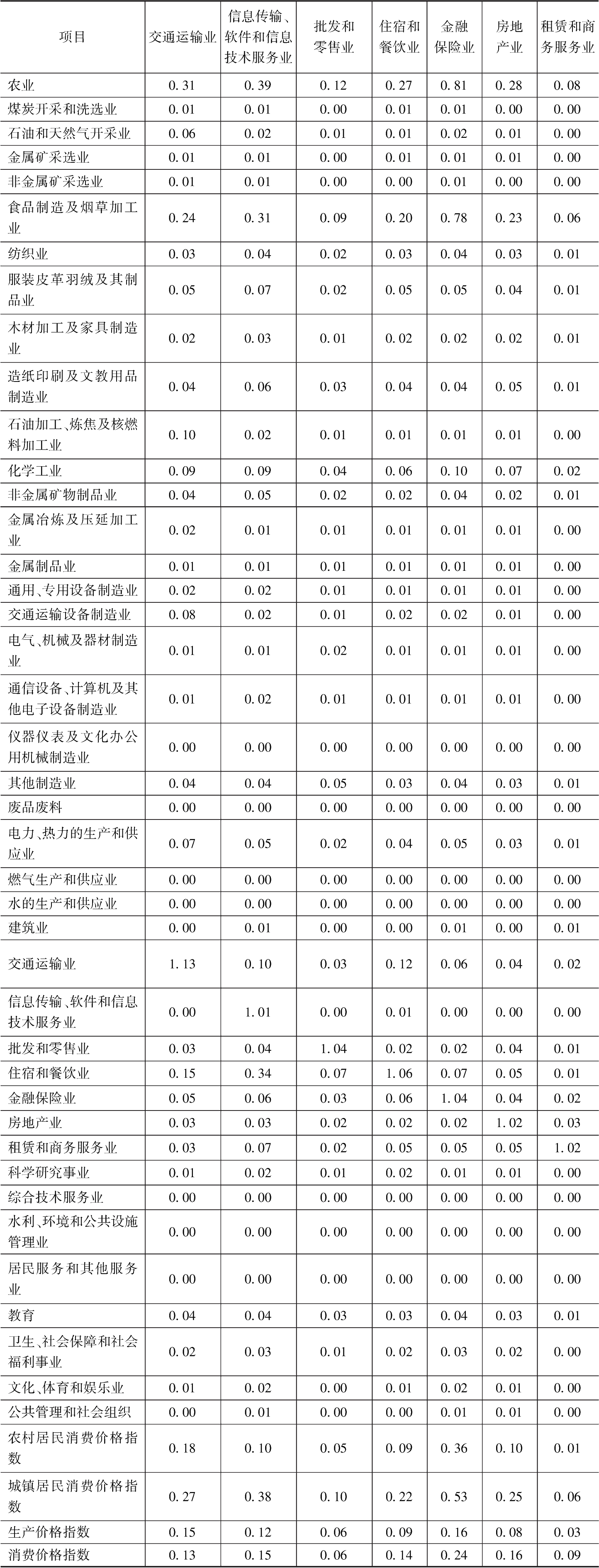 部分部門之間的相互影響主要是通過間接路徑發(fā)揮作用的。從信息傳輸、軟件和信息技術(shù)服務(wù)業(yè)對住宿餐飲業(yè)的價格傳導效應看,通過兩部門之間這種最短路徑所產(chǎn)生的效應僅占總體效應的10.7%,其他25%的效應是通過信息傳輸、軟件和信息技術(shù)服務(wù)業(yè)對金融業(yè)、批發(fā)零售業(yè)、其他制造業(yè)以及城市居民進一步影響到住宿餐飲業(yè)的,而且這五條最主要路徑所包含的傳導效果僅占總體效果的35%。因此,信息傳輸、軟件和信息技術(shù)服務(wù)業(yè)對住宿餐飲業(yè)之間的傳導路徑是非常多、非常復雜的。