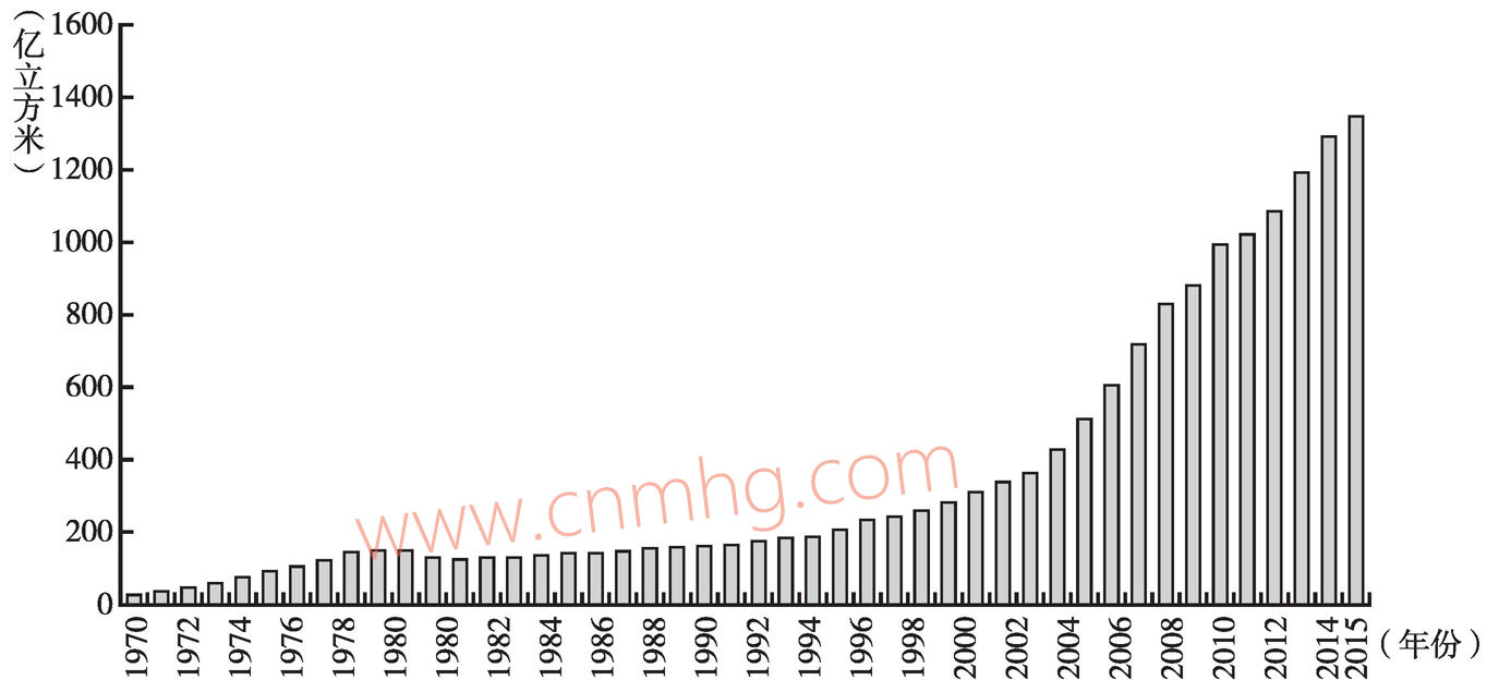 圖1-3 中國1970~2015年天然氣產(chǎn)量