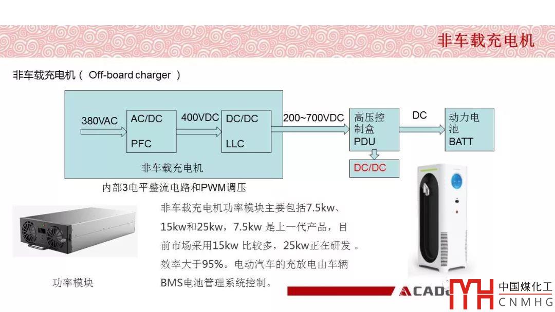 非車載充電機(jī)功率模塊主要包括7.5kw、15kw和25kw,7.5kw 是上一代產(chǎn)品,目前市場采用15kw 比較多,25kw正在研發(fā) 。效率大于95%。電動汽車的充放電由車輛BMS電池管理系統(tǒng)控制。