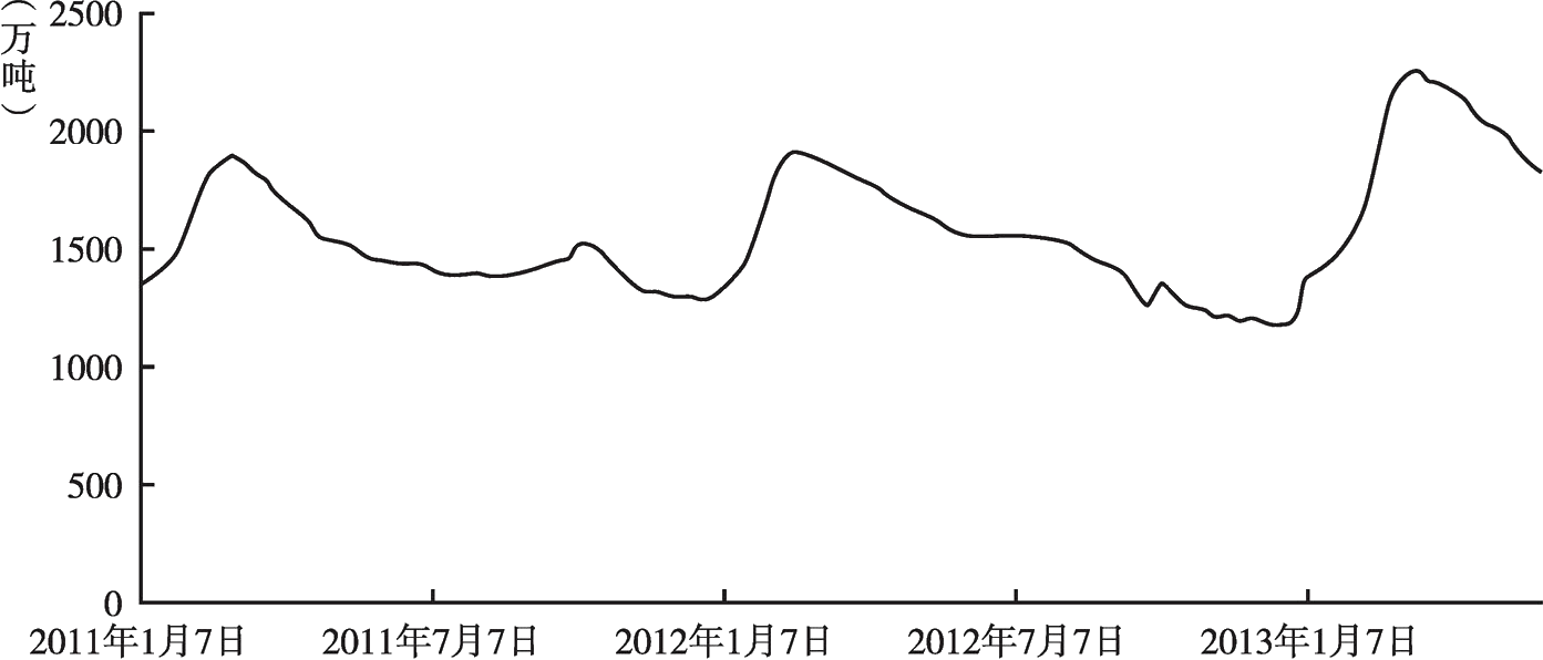 圖6 2011年1月至2013年7月五大品種鋼材社會(huì)庫(kù)存變化情況