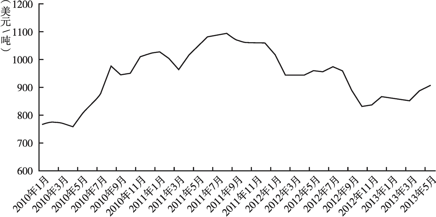 圖4 2010年1月至2013年5月鋼材出口平均價(jià)格月度變化情況
