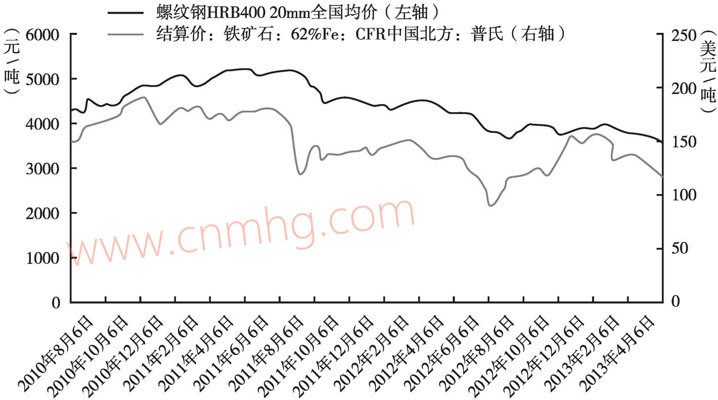 2011年下半年開(kāi)始,相對(duì)于鋼鐵價(jià)格變動(dòng),進(jìn)口鐵礦石價(jià)格呈現(xiàn)出更大的振幅,走勢(shì)也與鋼價(jià)不盡一致,導(dǎo)致市場(chǎng)存在較大的風(fēng)險(xiǎn),給鋼鐵企業(yè)的經(jīng)營(yíng)帶來(lái)了巨大的困難。以螺紋鋼國(guó)內(nèi)市場(chǎng)價(jià)格和同期普氏價(jià)格指數(shù)對(duì)比為例,從2011年下半年開(kāi)始,鋼價(jià)逐步下降,螺紋鋼全國(guó)均價(jià)從2011年9月初的5123.60元/噸下降到2012年2月最低的4386.80元/噸,降幅達(dá)到14.38%。而同期普氏中國(guó)北方鐵礦石的結(jié)算價(jià)則從116.75美元/噸升至145.25美元/噸,升幅達(dá)到24.4%。在我國(guó)鋼鐵價(jià)格下降的同時(shí),進(jìn)口鐵礦石價(jià)格逆勢(shì)上揚(yáng),對(duì)鋼鐵企業(yè)形成較大的成本壓力。接下來(lái),從2012年第2季度開(kāi)始,隨著鋼鐵價(jià)格的進(jìn)一步下降,鐵礦石價(jià)格終于開(kāi)始大幅下探,普氏中國(guó)北方鐵礦石的結(jié)算價(jià)從3月初的149.75美元/噸下降到8月初的95.52美元/噸,跌幅超過(guò)36%,而同期螺紋鋼全國(guó)均價(jià)從3月初的4397.6元/噸下降到8月初的3872.4元/噸,跌幅不到12%。鐵礦石的價(jià)格下降幅度遠(yuǎn)低于同期鋼鐵的價(jià)格下降幅度,鐵礦石價(jià)格的下降降低了鋼鐵企業(yè)成本,為2012年第4季度全行業(yè)盈利狀況好轉(zhuǎn)創(chuàng)造了條件。在此之后,鐵礦石價(jià)格再次高企,從2012年8月初的95.50美元/噸開(kāi)始,一路上揚(yáng)至2013年2月初的159美元/噸,增幅超過(guò)66%,而同期螺紋鋼全國(guó)均價(jià)在3872~4397元/噸的范圍內(nèi)波動(dòng),波動(dòng)幅度小于14%,在價(jià)格上升的過(guò)程中,鐵礦石價(jià)格跑贏了鋼鐵價(jià)格,又一次對(duì)鋼鐵企業(yè)的經(jīng)營(yíng)產(chǎn)生了巨大的成本壓力,進(jìn)一步壓縮了鋼鐵企業(yè)微薄的利潤(rùn)空間。
