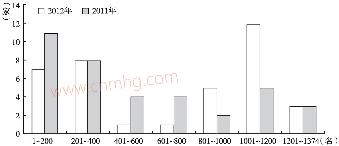圖15 2011年和2012年黑色金屬主板上市公司企業(yè)競(jìng)爭(zhēng)力排名分布