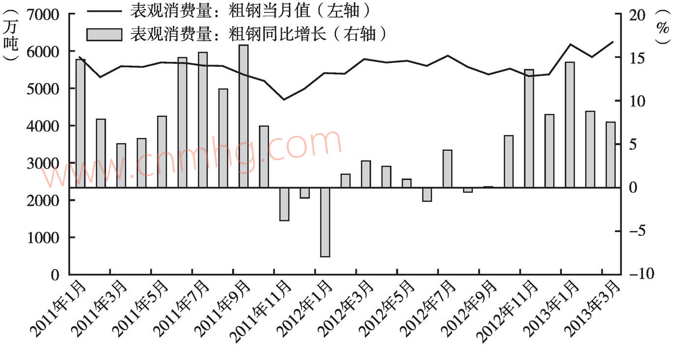 圖5 2011年1月至2013年3月我國(guó)粗鋼表觀消費(fèi)量月度變化情況