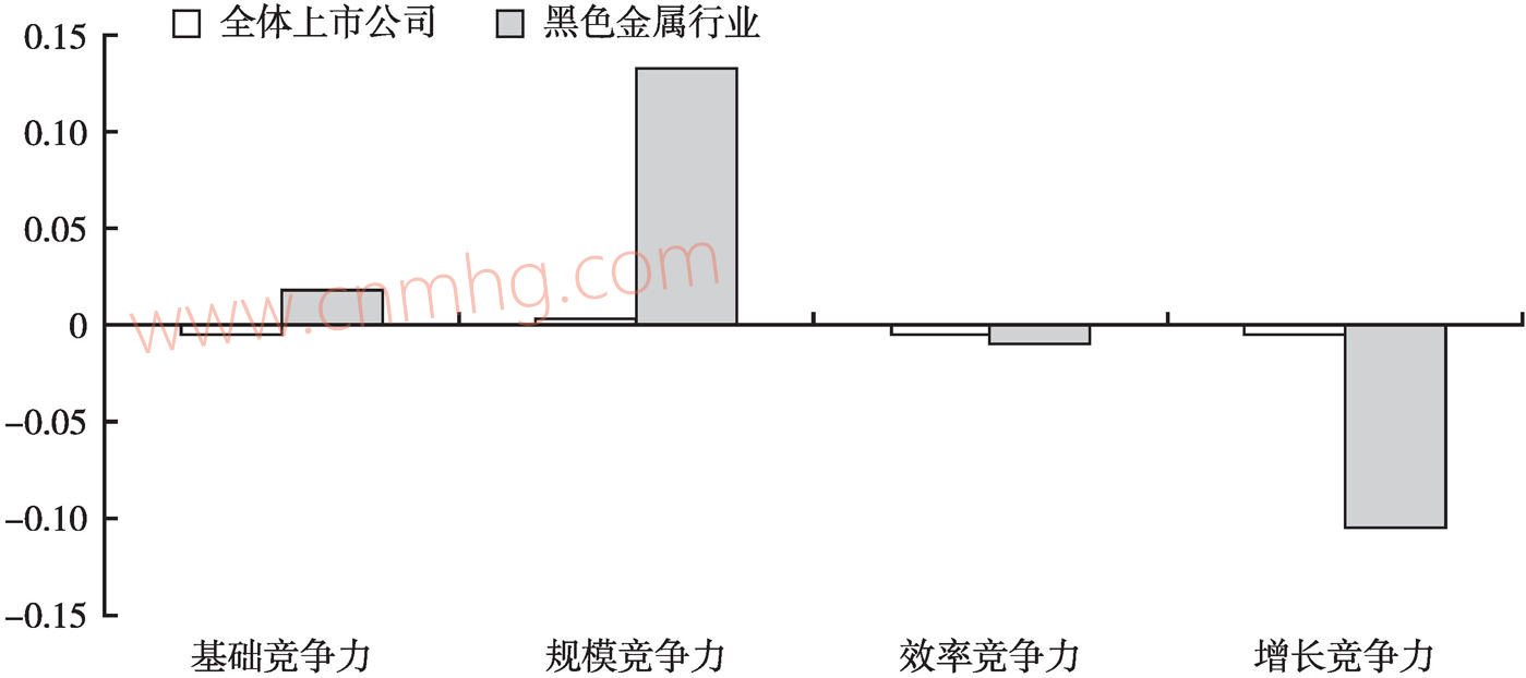 圖16 2012年黑色金屬行業(yè)上市公司與全部上市公司競(jìng)爭(zhēng)力指標(biāo)均值比較