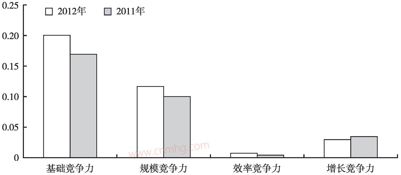 2012年黑色金屬上市公司的基礎(chǔ)競(jìng)爭(zhēng)力、規(guī)模競(jìng)爭(zhēng)力、效率競(jìng)爭(zhēng)力和增長(zhǎng)競(jìng)爭(zhēng)力的方差為0.2032、0.1170、0.0067和0.0305,較2011年該行業(yè)上市公司方差分別高出0.0321、0.0155、0.0017和-0.0045??梢钥闯?,隨著黑色金屬行業(yè)市場(chǎng)競(jìng)爭(zhēng)的加劇,行業(yè)內(nèi)企業(yè)競(jìng)爭(zhēng)力呈現(xiàn)出分化的趨勢(shì),部分競(jìng)爭(zhēng)力較強(qiáng)的企業(yè)能夠經(jīng)受住經(jīng)濟(jì)形勢(shì)下滑的考驗(yàn),競(jìng)爭(zhēng)力指標(biāo)仍然保持較高水平,而那些在市場(chǎng)快速擴(kuò)張時(shí)期進(jìn)入的企業(yè),則由于內(nèi)在競(jìng)爭(zhēng)力較低,隨著市場(chǎng)走低,相關(guān)競(jìng)爭(zhēng)力指標(biāo)明顯下降,從而導(dǎo)致不同企業(yè)之間競(jìng)爭(zhēng)力指標(biāo)差距拉大。