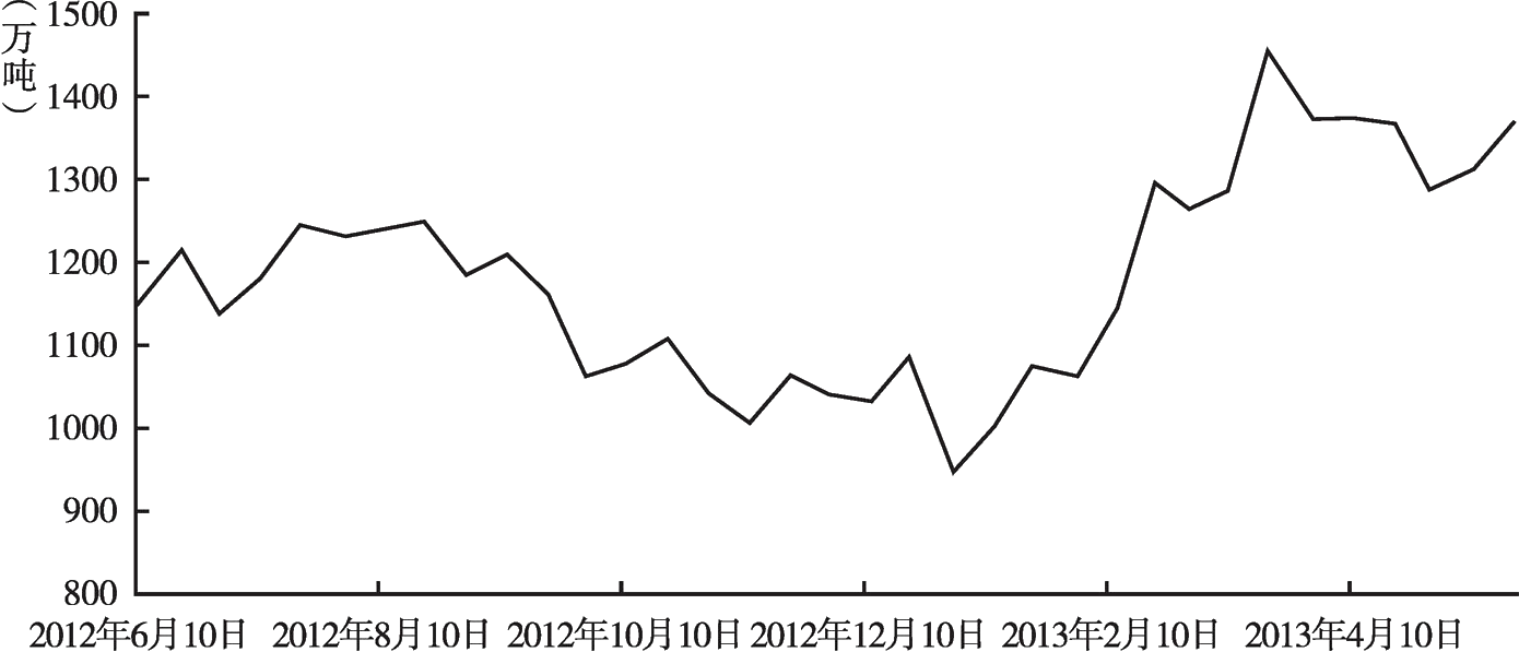 圖7 2012年6月至2013年4月重點(diǎn)鋼鐵庫(kù)存變化情況