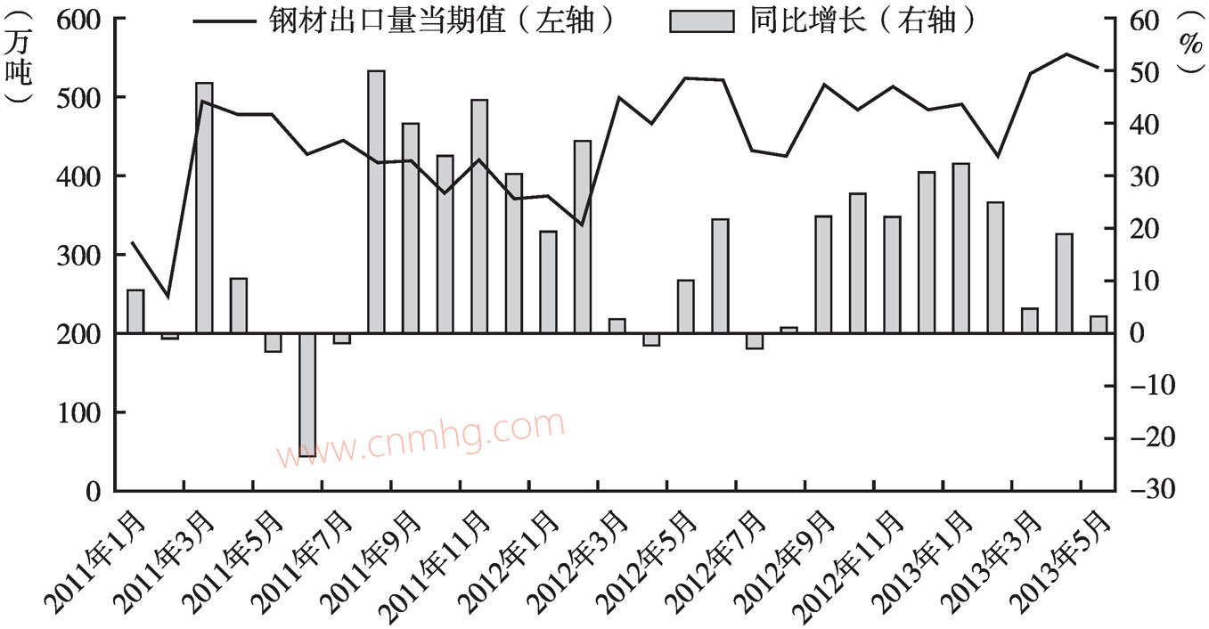 圖2 2011年1月至2013年5月我國(guó)鋼材出口量月度變化情況