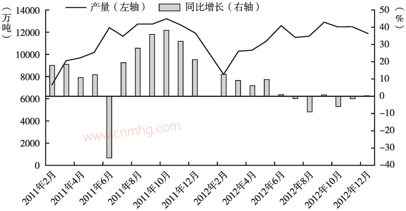 至2012年底,我國(guó)粗鋼、生鐵和鋼材當(dāng)年累計(jì)產(chǎn)量分別為71654.20萬(wàn)噸、65790.50萬(wàn)噸和95186.10萬(wàn)噸,比2011年同期增長(zhǎng)4.87%、4.48%和8.00%,增速比2011年分別下降4.16個(gè)、2.20個(gè)和2.67個(gè)百分點(diǎn)。