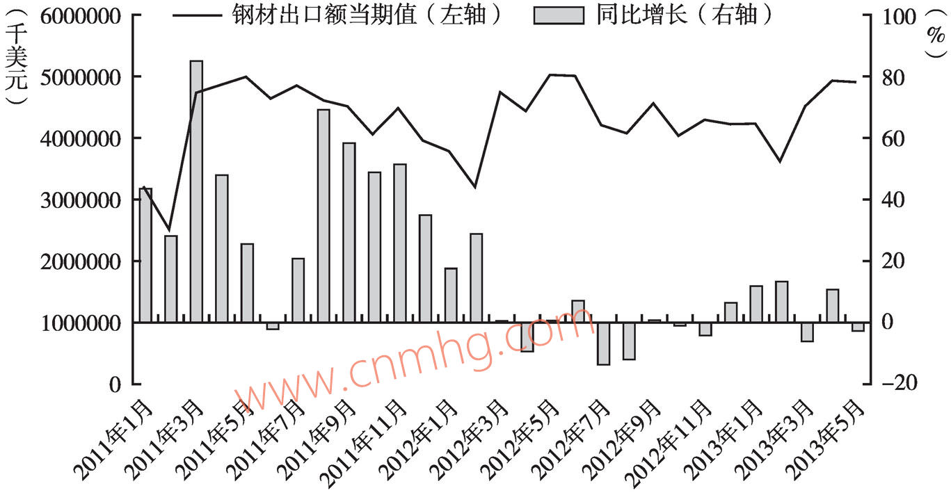 圖3 2011年1月至2013年5月我國(guó)鋼材出口額月度變化情況