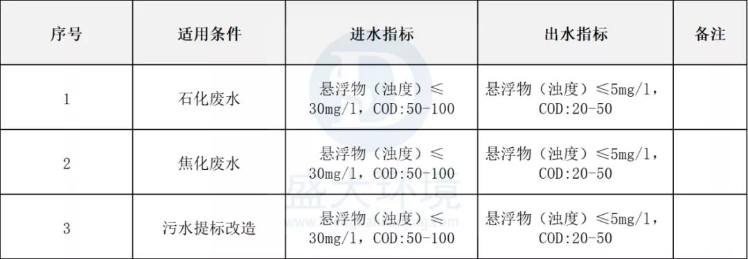 用于地表水的初級絮凝沉淀(低溫低濁)、生活污水及工業(yè)廢水的深度處理;中水回用的預(yù)處理(除濁);污水提標(biāo)改造等。