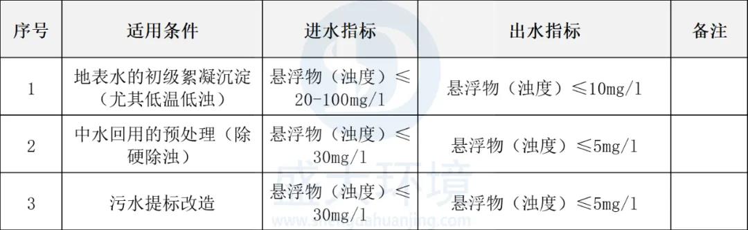 用于地表水的初級絮凝沉淀;生活污水及工業(yè)廢水的深度處理;中水回用的預(yù)處理(除硬除濁);污水提標(biāo)改造等處理單元。