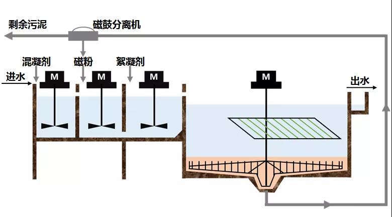 磁混凝分離沉淀工藝是在常規(guī)混凝沉淀反應(yīng)過程中引入磁粉,配合混凝沉淀前端的混凝過程,磁種作為絮凝過程的晶核,使混凝劑、懸浮物、絮凝劑三者有效結(jié)合,產(chǎn)生的絮體由于含大比重的磁粉,自身密度增加,使其在水中可以快速沉降。