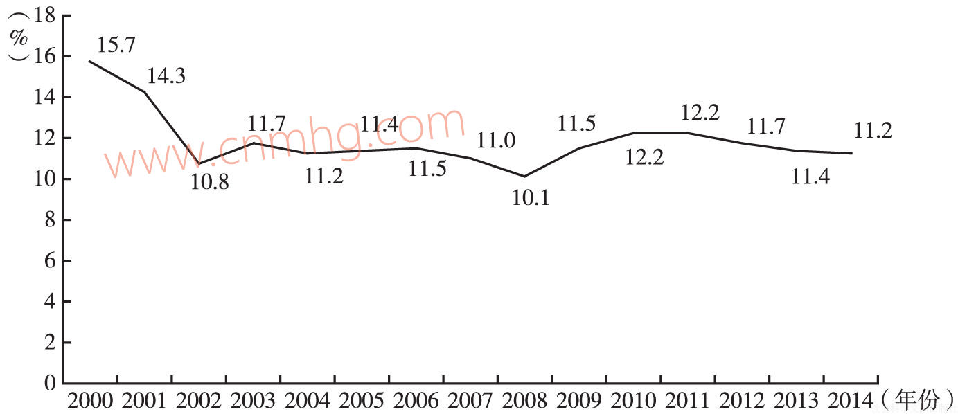 收入再分配是在初次分配的基礎(chǔ)上,通過經(jīng)常轉(zhuǎn)移對收入進行再次分配。再分配的結(jié)果是形成各個機構(gòu)部門的可支配收入。通常情況下,再分配環(huán)節(jié)居民的經(jīng)常轉(zhuǎn)移凈額規(guī)模不大,一般只占居民可支配收入的1%左右,因此,經(jīng)常轉(zhuǎn)移只是對居民收入的小幅調(diào)整,居民部門收入初次分配和再分配環(huán)節(jié)的占比十分接近。2014年,居民可支配收入為39.1萬億元,占國民可支配總收入比重為60.6%,比2013年上升0.1個百分點,若不考慮研發(fā)支出核算方法改革,2014年居民部門可支配收入占國民可支配總收入比重為61.4%,為2004年以來的最高水平。表1-2的數(shù)據(jù)序列顯示,2000~2014年,居民可支配收入占國民可支配收入的比重也可以明顯地分為兩個階段: