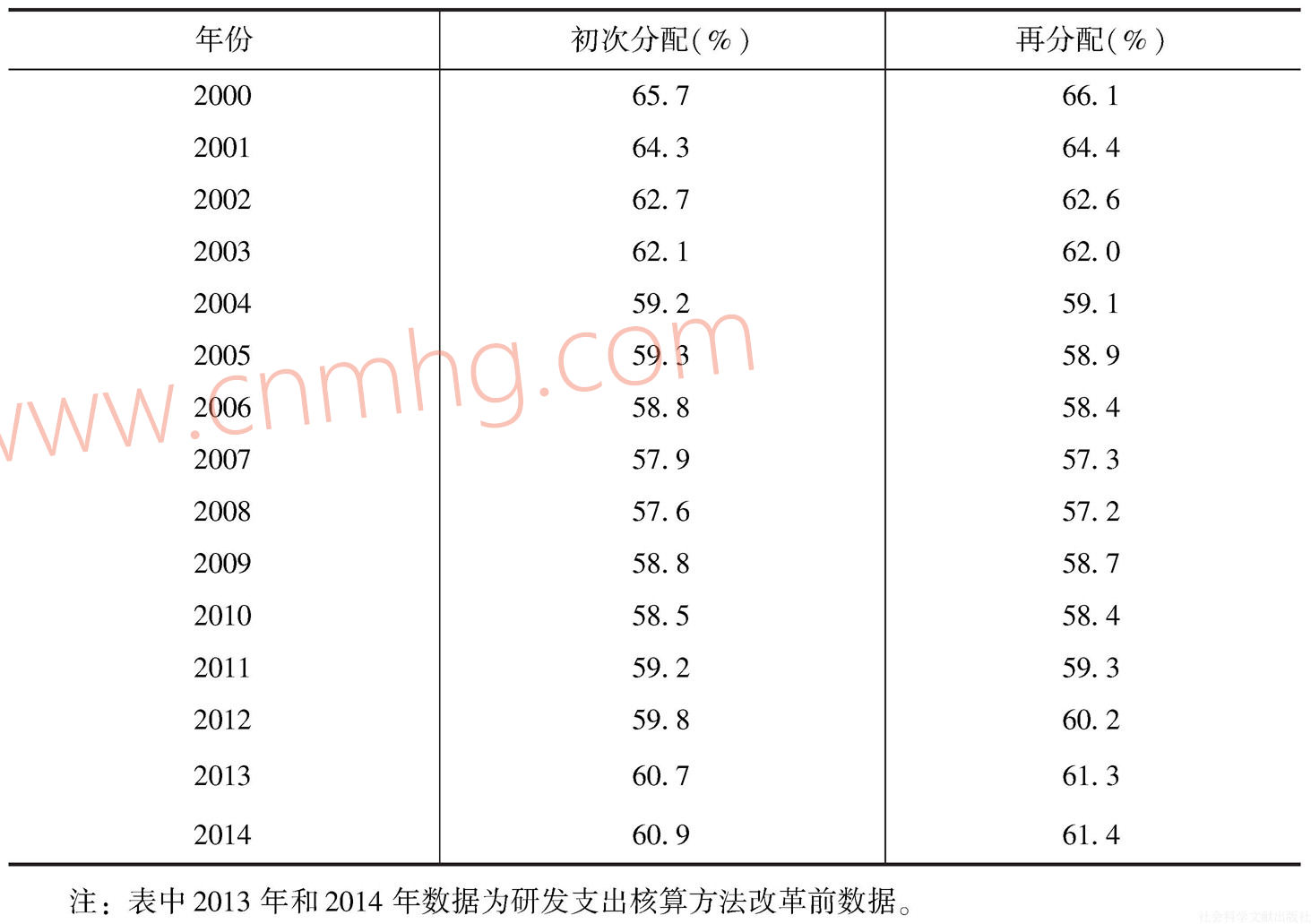 表1-2 2000年以來居民收入在初次分配和再分配中的占比