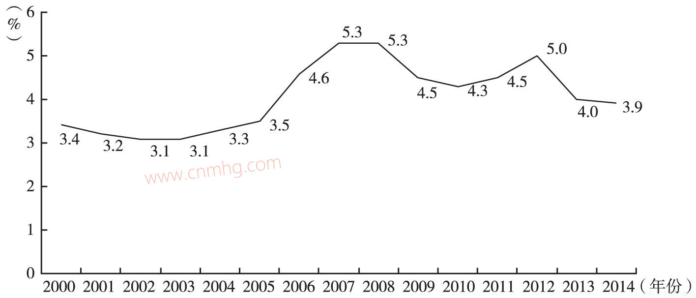 從圖1-2我們可以看到,2000~2007年,勞動者報酬在國民總收入中的比重總體呈下降的趨勢,由2000年53.0%下降至2007年的48.5%。2008~2009年,勞動者報酬占GNI比重明顯上升,達到49.2%,比2007年提高0.7個百分點,2010年有所回落后持續(xù)回升,2014年勞動者報酬達到32.8萬億元,占國民總收入比重為51.6%,比2013年上升0.3個百分點。根據(jù)現(xiàn)有資料推算,2015年勞動者報酬占國民總收入的比重將會繼續(xù)提高。勞動者報酬是居民收入的主要來源,占居民可支配收入的比重超過80%,勞動者報酬平穩(wěn)較快增長有利于提高居民收入比重,改善宏觀收入分配格局。