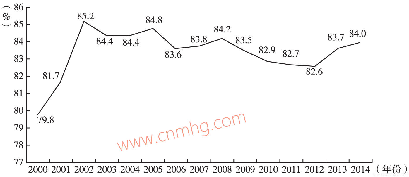 2000~2014年,除2000年外,勞動者報酬占居民可支配收入的比重均在80%以上,近年來圍繞83%上下波動。具體來看,2000~2002年,勞動者報酬在居民可支配收入中的占比上升較快,由79.8%上升至85.2%,之后緩慢下降,2008年后一直在83%左右。勞動者報酬是居民收入的主要來源,保持勞動者報酬的較高增速有利于改善居民在國民收入分配格局中的地位。