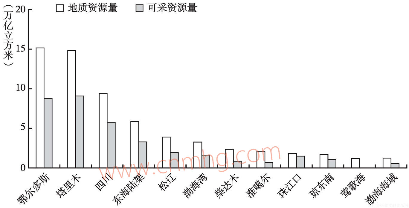 我國天然氣資源儲(chǔ)量豐富,但受地質(zhì)條件限制,天然氣資源分布極不均衡,呈聚集區(qū)或聚集帶分布。2015年,我國常規(guī)天然氣地質(zhì)資源量為90.3萬億立方米,可采資源量為50.1萬億立方米,其中,致密氣地質(zhì)資源量為22.9萬億立方米、可采資源量為11.3萬億立方米[4]。大型含油氣盆地是我國天然氣資源的主要集中地,鄂爾多斯、四川、塔里木、柴達(dá)木、珠江口、瓊東南、東海陸架、鶯歌海、松遼9個(gè)盆地的天然氣資源量、儲(chǔ)量和產(chǎn)量貢獻(xiàn)超過全國的80%[5]。