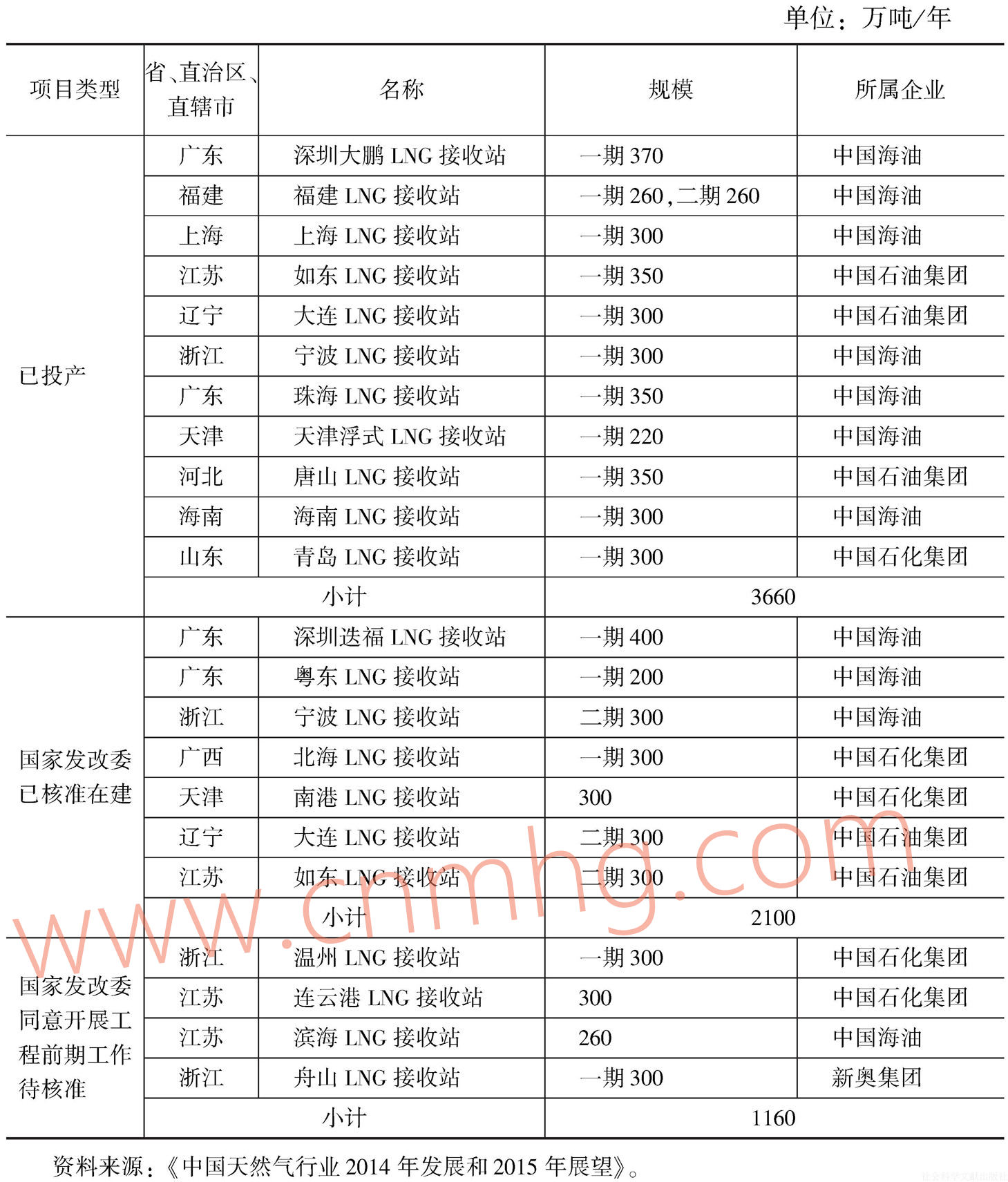 表7 中國LNG接收站建設(shè)情況(截至2014年底)