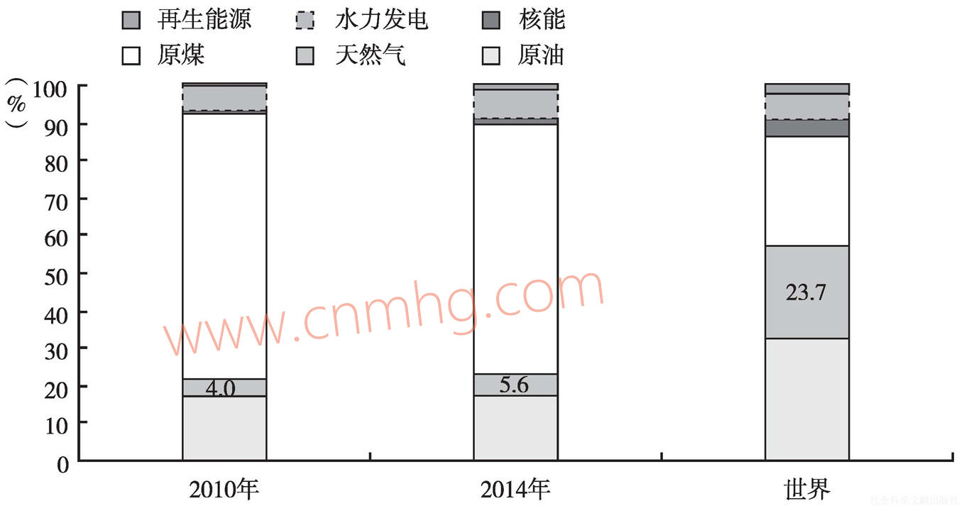 圖5 2010~2014年我國一次能源消費(fèi)結(jié)構(gòu)及與世界對比