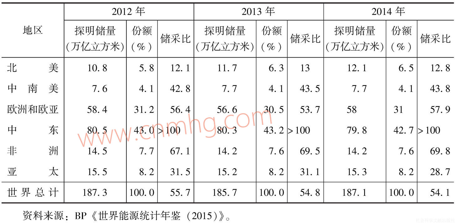 表2 2012~2014年世界天然氣探明儲(chǔ)量、份額和儲(chǔ)采比地區(qū)分布