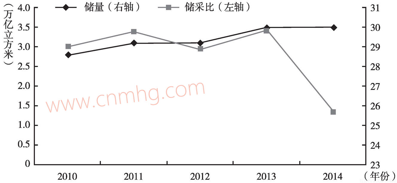 BP數(shù)據(jù)顯示,近年來我國天然氣探明儲(chǔ)量持平,但儲(chǔ)采比呈下降趨勢。2014年我國天然氣儲(chǔ)量為3.5萬億立方米,與往年相比持平;2014年我國天然氣儲(chǔ)采比為25.7,而世界儲(chǔ)采比為54.1,我國天然氣可開采年數(shù)約為26年,與往年相比,大幅下降(見圖10)。隨著低碳經(jīng)濟(jì)的發(fā)展,以及能源結(jié)構(gòu)調(diào)整和空氣清潔計(jì)劃實(shí)施的需要,我國應(yīng)進(jìn)一步加強(qiáng)內(nèi)陸氣田和海域國產(chǎn)天然氣的勘探,提高儲(chǔ)采比,降低對海外天然氣的依存度。