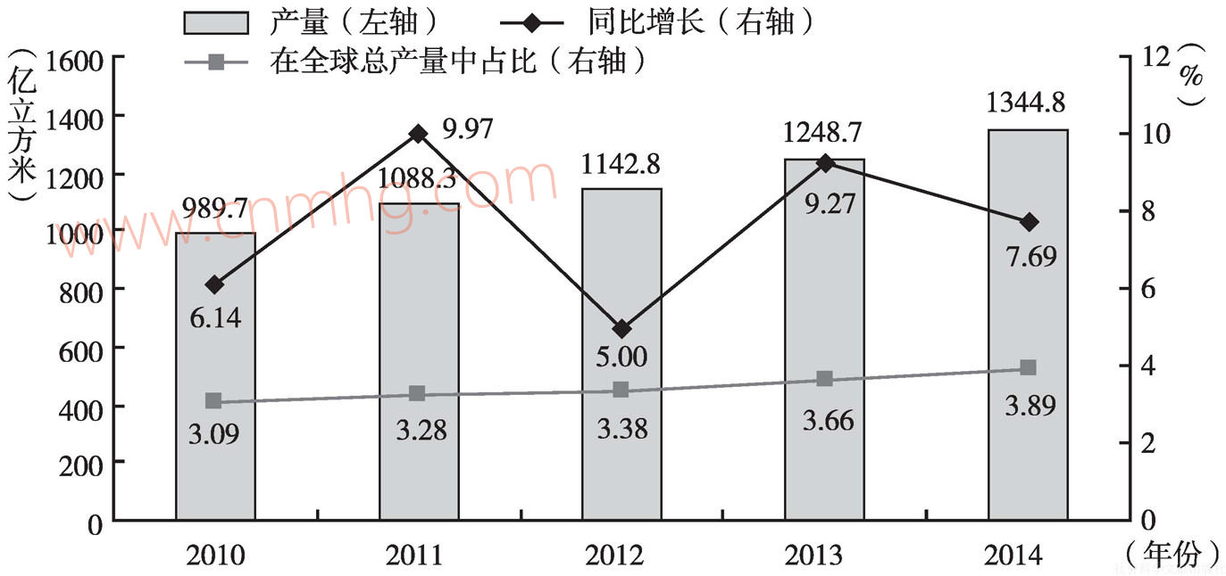 圖2 中國2010~2014年天然氣產(chǎn)量及占比