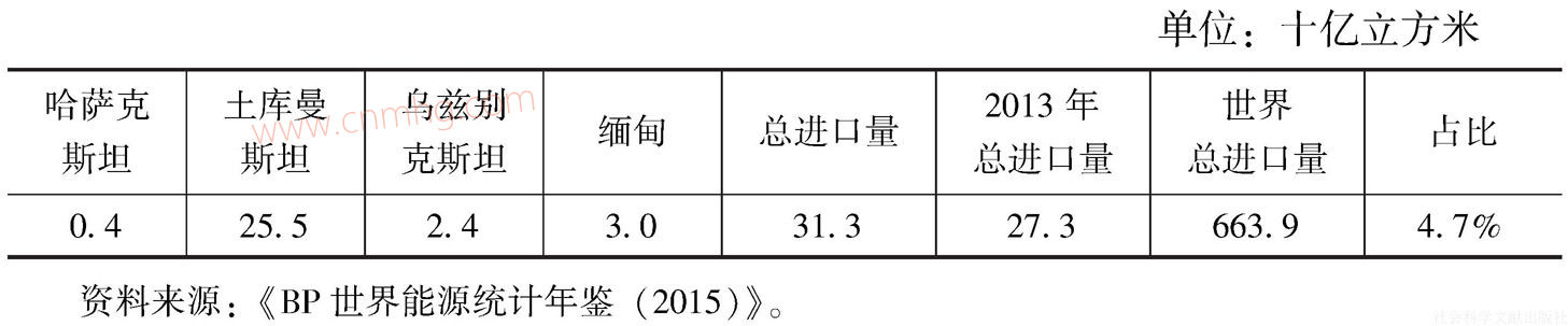《BP世界能源統(tǒng)計(jì)年鑒(2015)》數(shù)據(jù)顯示,2014年,我國管道天然氣進(jìn)口量為313億立方米,占世界總進(jìn)口量的4.7%,較2013年增長14.6%(見表4)。我國主要從土庫曼斯坦、緬甸、烏茲別克斯坦、哈薩克斯坦進(jìn)口管道天然氣,供應(yīng)最多的國家是土庫曼斯坦(占2014年管道天然氣進(jìn)口量的93.41%)。