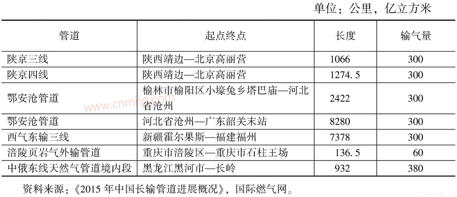 2015年1月,陜京三線天然氣管道工程全線建成投產(chǎn)。該工程全長1066公里,設(shè)計(jì)輸量為300億立方米/年。2015年2月,陜京四線北京軍都山隧道全線貫通。陜京四線全長1274.5公里,年輸氣能力為250億立方米。2015年3月,鄂爾多斯—安平—滄州輸氣管道工程(鄂安滄管道)項(xiàng)目總長2422公里,輸氣能力為300億立方米/年。新粵浙管道項(xiàng)目即中國石化新疆煤制天然氣外輸管道工程,全長8280公里,年輸氣能力為300億立方米。2015年4月25日,西氣東輸三線東段隧道主體工程全面完工。西氣東輸三線工程全長7378公里,設(shè)計(jì)輸量為300億立方米/年。2014年8月西氣東輸三線西段全線貫通,中段預(yù)計(jì)將于2016年底建成投產(chǎn)。