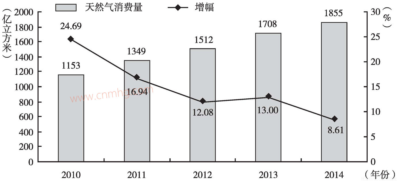 圖4 2010~2014年我國天然氣消費(fèi)量及增速