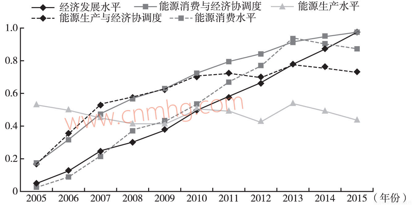其中,β、σ和θ分別為經(jīng)濟(jì)發(fā)展評價(jià)指標(biāo)、能源消費(fèi)評價(jià)指標(biāo)和能源生產(chǎn)評價(jià)指標(biāo)的倒數(shù)。利用上述公式測算出2005~2015年河南經(jīng)濟(jì)發(fā)展、能源消費(fèi)和能源生產(chǎn)變化趨勢(見圖6)。從分析結(jié)果看,2005~2015年,河南經(jīng)濟(jì)發(fā)展水平不斷提升;能源生產(chǎn)水平“先升后降”,總體上呈波動下降的態(tài)勢。2005~2009年,河南能源生產(chǎn)水平逐年下降,2010年和2013年略有回升,2011~2012年和2014~2015年延續(xù)下降的趨勢。從經(jīng)濟(jì)、能源發(fā)展水平的對比看,2008~2015年,河南經(jīng)濟(jì)發(fā)展水平均低于能源消費(fèi)水平,特別是2010~2013年二者差距呈擴(kuò)大趨勢,2014~2015年二者差距略微縮?。?005~2009年能源生產(chǎn)水平高于經(jīng)濟(jì)發(fā)展水平,2011~2015年則低于經(jīng)濟(jì)發(fā)展水平。