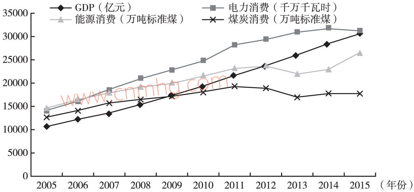 圖2 2005~2015年河南分類能源消費(fèi)與地區(qū)生產(chǎn)總值變化趨勢