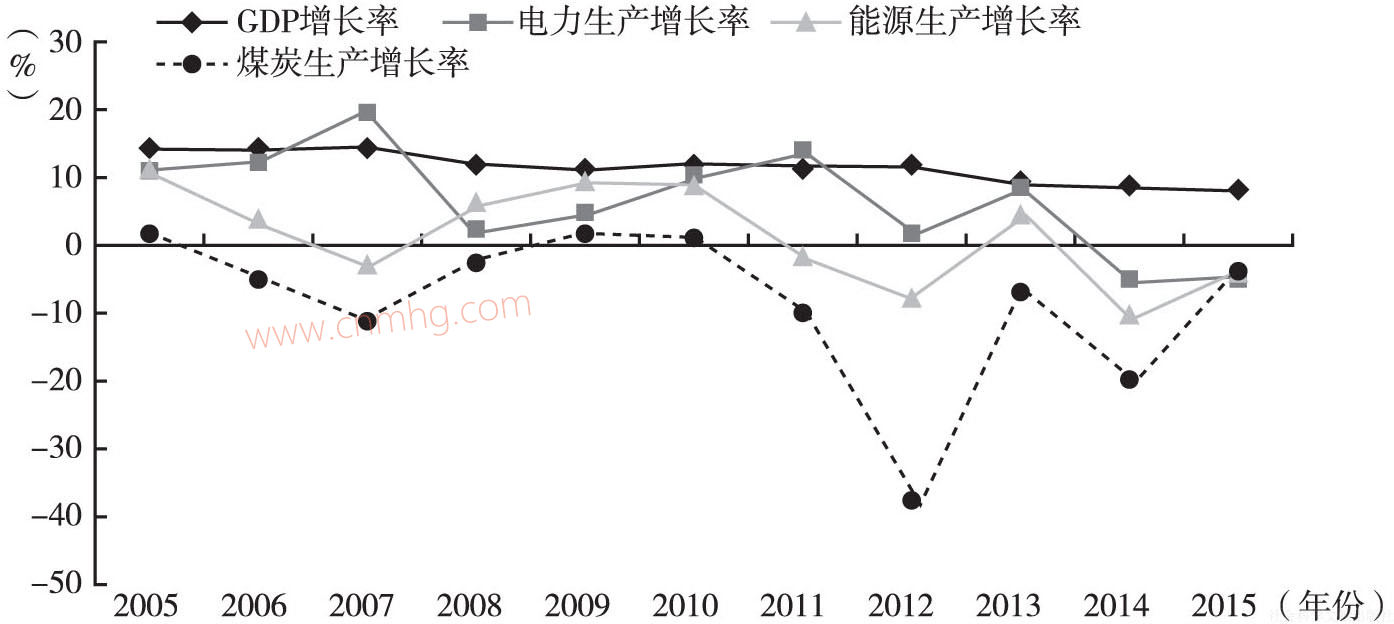 圖3 2005~2015年河南分類能源生產(chǎn)增長與經(jīng)濟(jì)增長的關(guān)系