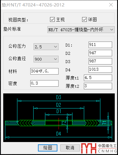 VCAD的查詢還不止如此,在畫(huà)圖模塊中查詢也能獲得相應(yīng)的數(shù)據(jù),以設(shè)備法蘭墊片模塊為例,不但能夠繪制主視圖和詳圖,還能在不畫(huà)圖的情況下,獲得墊片的各種數(shù)據(jù)。