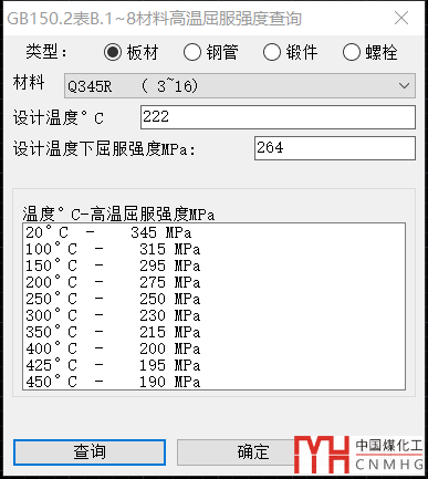 2. 高溫屈服強(qiáng)度查詢。根據(jù)GB/T150.2-2011的表B.1~8,查詢板材,鋼管,鍛件和螺栓材料的高溫屈服強(qiáng)度,并根據(jù)溫度插值。