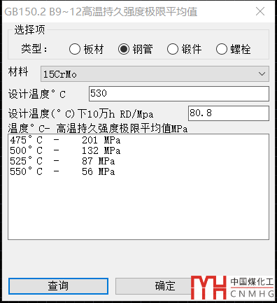 3. 高溫持久強(qiáng)度極限平均值查詢。根據(jù)GB/T150.2-2011的表B.9~12,查詢板材,鋼管,鍛件和螺栓材料的高溫持久強(qiáng)度極限平均值,并根據(jù)溫度插值。