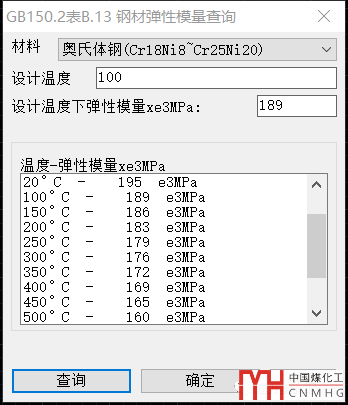 4. 彈性模量查詢。根據(jù)GB/T150.2-2011的表B.13,查詢碳鋼,CrMo鋼,奧氏體鋼,雙相鋼等材料的彈性模量,可自動(dòng)插值。