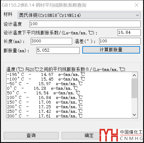 5. 鋼材平均線膨脹系數(shù)查詢。根據(jù)GB/T150.2-2011的表B.14,查詢碳鋼,CrMo鋼,奧氏體鋼,雙相鋼等材料的平均線膨脹系數(shù),可以自動(dòng)插值。當(dāng)輸入長(zhǎng)度和溫差時(shí),還可以計(jì)算膨脹量。